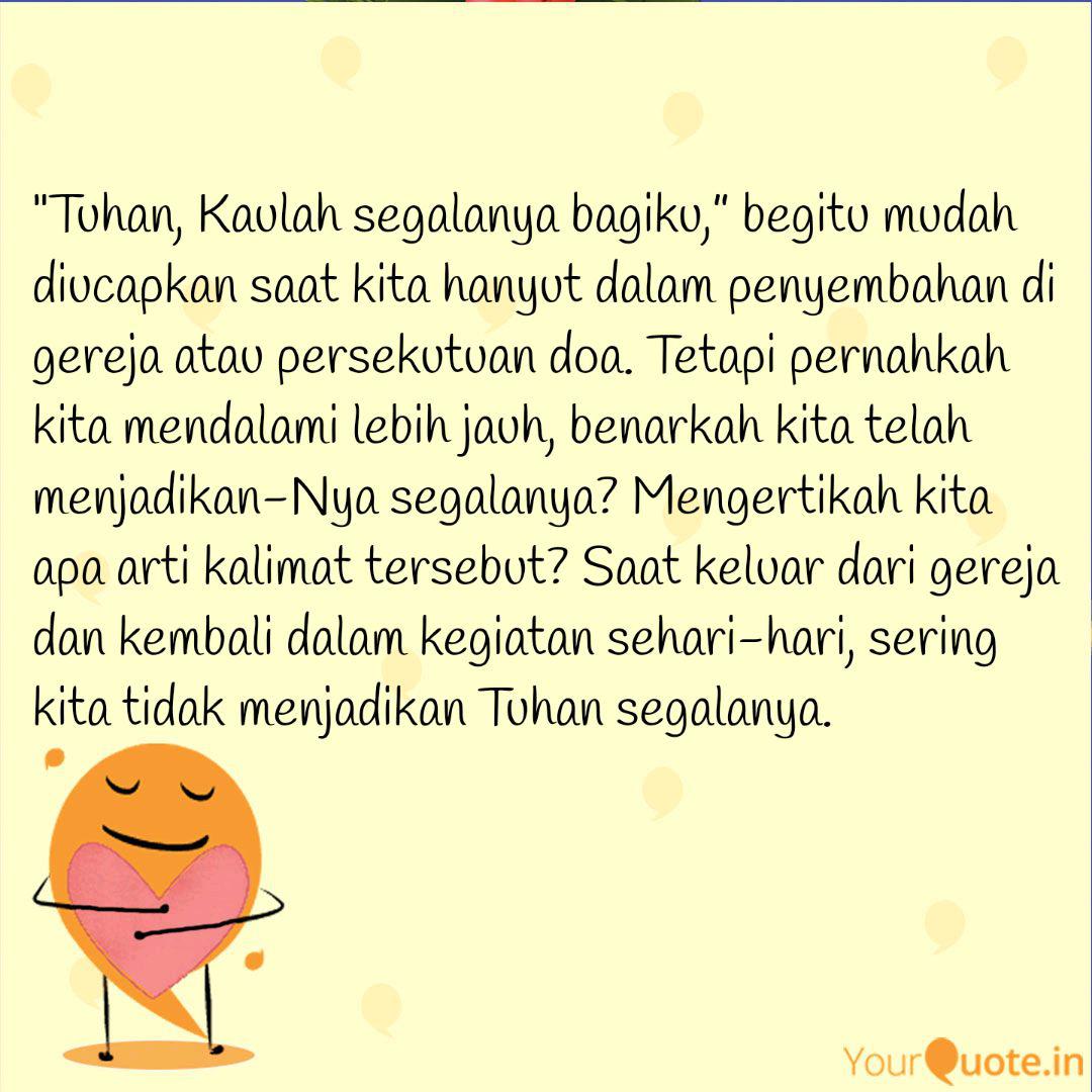 Inspirasi Cinta Kau Segalanya Bagiku from 2.bp.blogspot.com Kaulah segalanya di dalam hidupku kerajaanmu kebenaranmu itu bagianku kaulah yang kupandang selama hidupku mengasihimu memuliakanmu bapa dan rajaku kau bapa yang mengasihiku kuasamu memulihkanku hati yang baru kau berikan untukku dapat melihat rencanamu indah bagiku kau ada di setiap jalanku hatiku haus dan lapar akan engkau kaulah segalanya di dalam hidupku More images for kau segalanya bagiku kau segalanya di hidupku » C#m a c#m a e/g# g#/c c# a b verse : About press copyright contact us creators advertise developers terms privacy policy & safety how youtube works test new features press copyright contact us creators. Oct 17, 2016 · chord kaulah segalanya (true worshippers) intro : Verse aku mau bersyukur dengan segenap hatiku aku mau memb'ritakan tentang kuasamu yang ajaib aku mau bersukacita dan bersukaria bermazmur bagi namamu yang mahatinggi chorus kaulah tuhan, kaulah raja engkau perisai hidupku kes'lamatan, pengharapan dalam hidupku gunung batu, kota bentengku dan tempat perlindunganku tiada allah sepertimu, ya yesusku kau s'galanya bagiku (chorus) kaulah segalanya, di dalam hidupku. Jul 21, 2017 · lyrics for detak di hidupku by maria shandi.